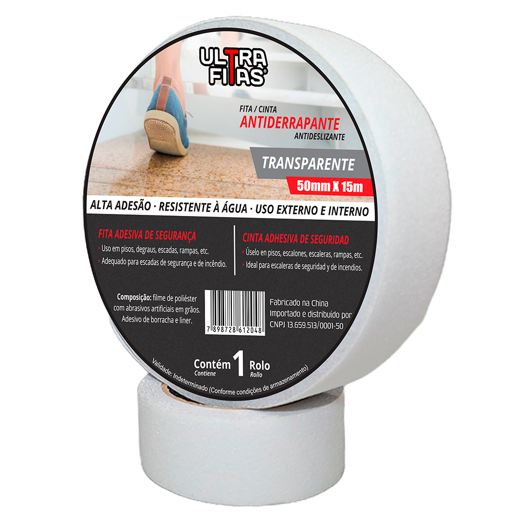 Fita antiderrapante Transparente 15 metros Ultra Fitas: Indicada para uso interno e externo graças a alta resistência à água e corrosão, com largura padrão de 50mm e alta aderência, a Fita Ultra Fitas entrega segurança em todos os locais que for instalada.