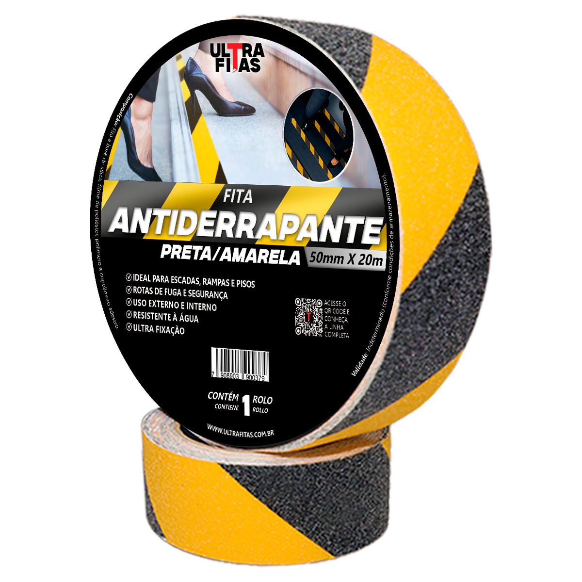 Fita antiderrapante ULTRA FITAS: Indicada para uso interno e externo graças a alta resistência à água e corrosão, com espessura e aderência equiparada às melhores do mercado.