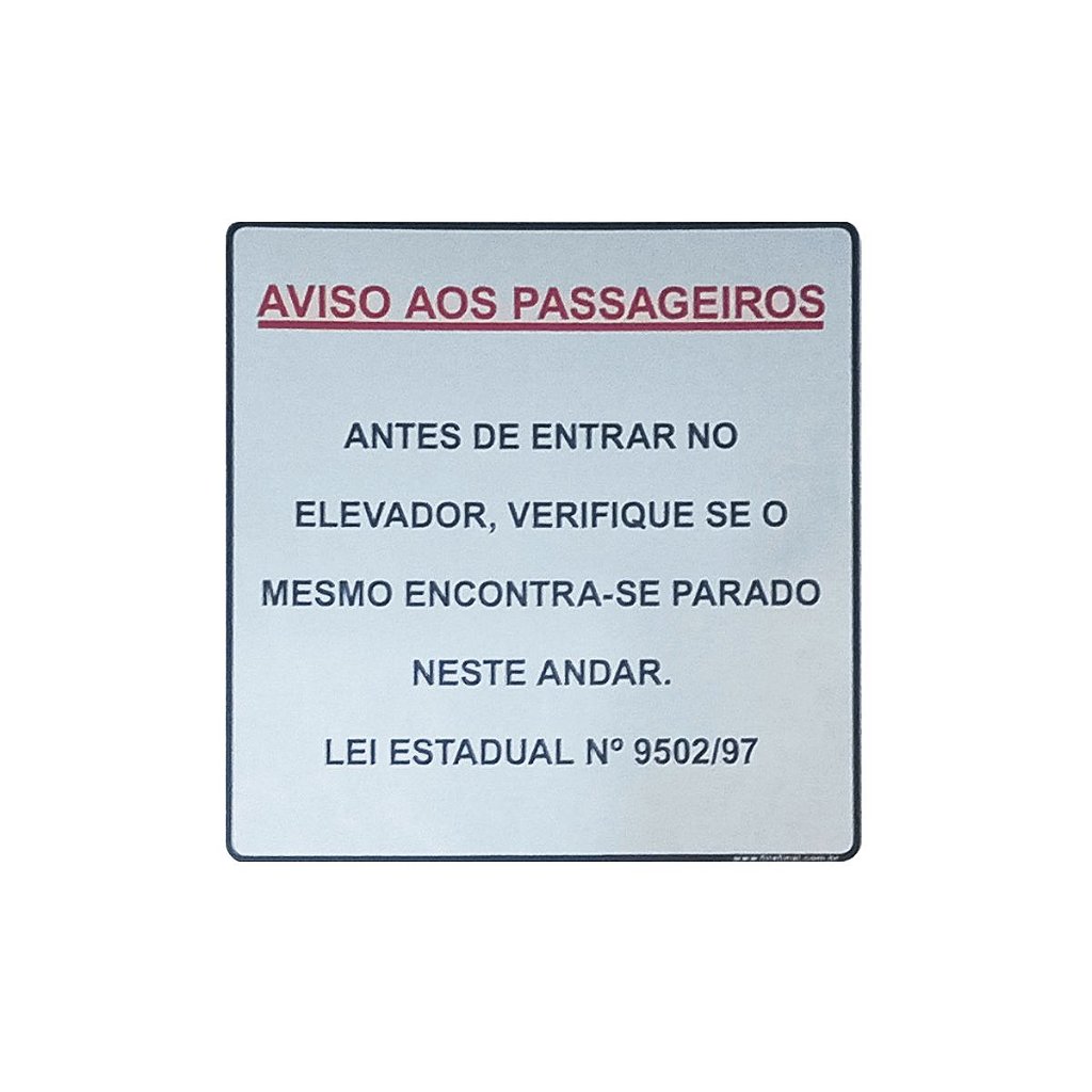 Texto da Placa: AVISO AOS PASSAGEIROS, Antes de entrear no elevador, verifique se o mesmo encontra-se parado neste andar. Lei Estadual ;